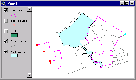 Click on the Launch Parcel Editor button, located on the Main Menu. Choose to edit the parklines1 theme. The parklines1 theme will go to the top of the list of themes and will become editable (it will have a dotted line around its checkbox). Unclick the checkbox of the park.shp polygon theme so the line theme will be easier to see. You will also notice that there are a few light blue dots drawn on some of the corners of the line theme. These are node markers. A new dialog has appeared--move it to the left edge of the screen. Minimize the Main Menu to prevent it from blocking the View.